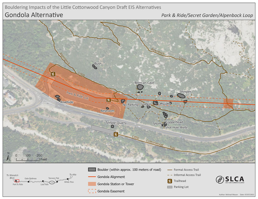In 2021, the Utah DOT released a Draft EIS with major implications for climbing recreation in Utah's Little Cottonwood Canyon. I created a series of maps to visually communicate the proposed alternatives and to determine the extent of impacts to climbing resources.
